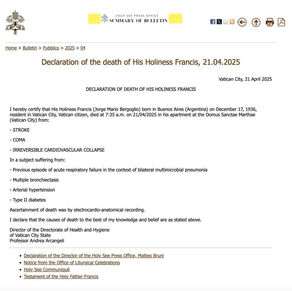 The supreme leader of the Catholic Church and the Bishop of Rome died on Monday, April 21, after suffering a stroke and cardiac arrest.